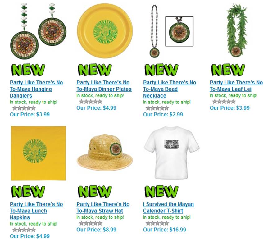 Partiler organize edilir de parti malzemeleri olmaz mı… 21 Aralık 2012’yi ticarete dönüştüren bir firma ise Maya takvimi baskılı karton yemek tabaklarından, peçeteye, kolyelerden şapkaya kadar pek çok ürün satıyor internet üzerinden. En ilgi çekici olanı ise “I survived the Mayan Calendar” yazılı baskılı tişörtler.