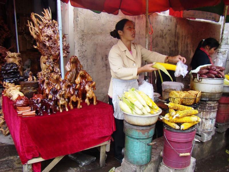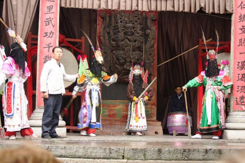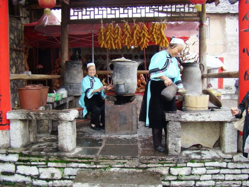Köyü dolaşırken bir gümüş dükkânı, taze egzotik meyveler, mısır kebap ve çeşitli hediyelik eşyalar, bez bebekler, tahta heykeller satan kadınlara rastlıyoruz sırtlarına bağladıkları bebekler çok şirin. Bol mısır, patates ve ceviz var yörede. Gelenekleri ile ilgili enteresan bilgileri aldıktan sonra meydana geldiğimizde bizim için hazırlanmış, renkli kıyafetleri ile savaşa giden askerleri eğlendirmek amacıyla yapılan, şimdilerde ise turistik olan maskeli bir gösteriyi izledikten sonra geceyi geçireceğimiz Anshun’a gidiyoruz (Otelimiz 4 yıldızlı Grand Waterfall Hotel).