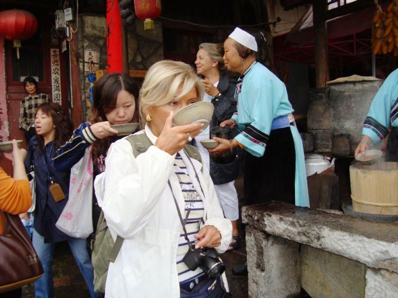 Kanal boyunca konumlanmış köyde taş evlerin dizildiği daracık sokaklarda yürürken yerli halk bize çeşitli otlardan yapılmış geleneksel çaylarını ikram ediyorlar. Eskilerde savaşa giden askerlere güçlerini arttırması için ikram edilen bu çayların ikramını geleneksel olarak devam ettiriyorlar. Çayları ikram eden köylü kadınların hepsi güler yüzlü. Başlarındaki şapkaların anlamları var; sosyal durumlarını anlatıyor, örneğin beyaz çizgi torunu olmadığını gösteriyor. Genç kızlar, evliliğe hazırlanırken zaten Buddha’ya ait olduğuna inandıkları saçlarını kesip erkek tarafına göndererek tüm kötülüklerden korunacaklarına inanıyorlarmış. Evlendikleri gün ve kocaları askere giderken ise kocasına saçları beyazlanana kadar sadık göstereceğinin sembolü olarak başlarına beyaz bir bez bağlıyorlarmış. Kadınların giysileri ve kendi yaptıkları ayakkabıları da özel, eskiden ayakları küçük kalsın diye ayaklarını sararlarmış, küçük ayakkabılarının altında da tehlikelere ve düşmanlara karşı kullanmak üzere bıçak saklarlarmış.