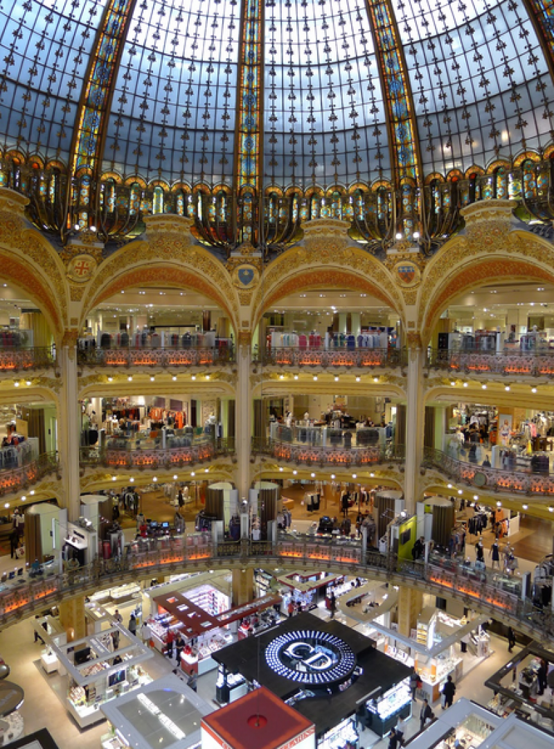 Louvre'dan ayrılmadan, bahçesindeki kafelerden birinde kahve içip biraz dinleniyoruz. Kahve içtikten sonra, yeteri kadar dinlenmiş ol maliyiz ki otele dönmektense Paris'in ünlü alışveriş merkezi La Fayette'yi görmeye karar veriyoruz. Terasından Paris'i izleyebileceğiniz 8 katlı alışveriş merkezinin geçmişi 1893 yılına dayanıyor. Burada da biraz zaman geçirdikten sonra, Eiffel Kulesi'ni bir kez de gece görmek için Eiffel'e doğru yola çıkıyoruz.