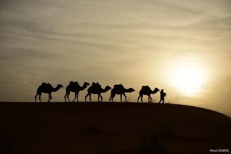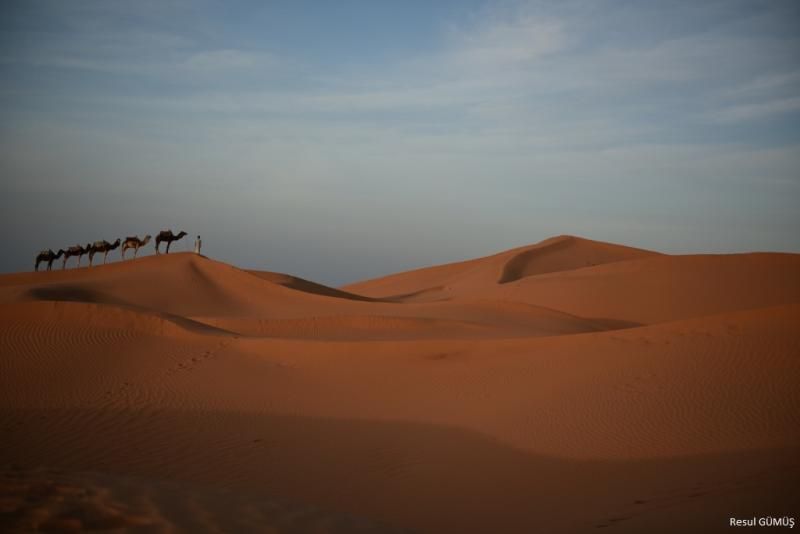 Zogara’dan Merzuga’ya doğru yola çıktık, yani bir çölden başka bir çöle. Amacımız akşama kadar 300 km’lik yolu kat edip akşam gün batımında develeri fotoğraflayabilmek. Yol kısa gibi gelebilir ancak buradaki yollar insana daha uzun geliyor. Gidiyorsun gidiyorsun, sonra bir bakıyorsun tabelaya ancak 50 km gitmişsin. Böyle durumlarda buradaki kilometre anlayışının bile farklı olduğunu düşünmeye başladık bir ara.
