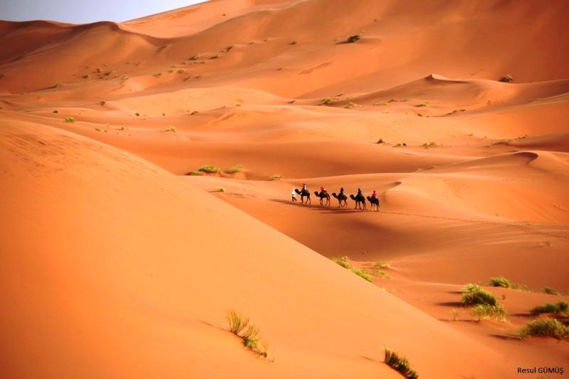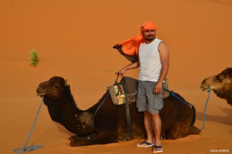 Develeri çölde ağır hareket eden hayvanlar olarak bilirsiniz eminim benim gibi. Evet susuzluğa en fazla dayanabilen bu hayvanlar yavaş yürüseler de emin olun o adımlar bize göre hızlı. Çünkü bir saatte iyi bir yol aldığımızı gittiğimiz yerin yarısını fotoğraf çekmek amaçlı yürüyerek geri dönerken anladık. Buradaki develerin eti, sütü, derisi ve yünü haricinde bir de turistlere çölde binek olma özelliği de para kazandırıyor Fas’lılara. Bu hayvanların uzun bacakları, yumuşak yayvan iki toynaklı ayakları kumda yürümesini kolaylaştırıyor. Bu hayvanlar bir seferde 80-90 litre su içebiliyorlar ve 50 °C sıcaklıkta 9 gün aç ve susuz kalabiliyorlar. İnsanoğlu vücudunda bulunan suyun %12'sini kaybettiğinde ölürken, deve, vücudundaki suyun %40'ını kaybettiği halde ölmüyor.