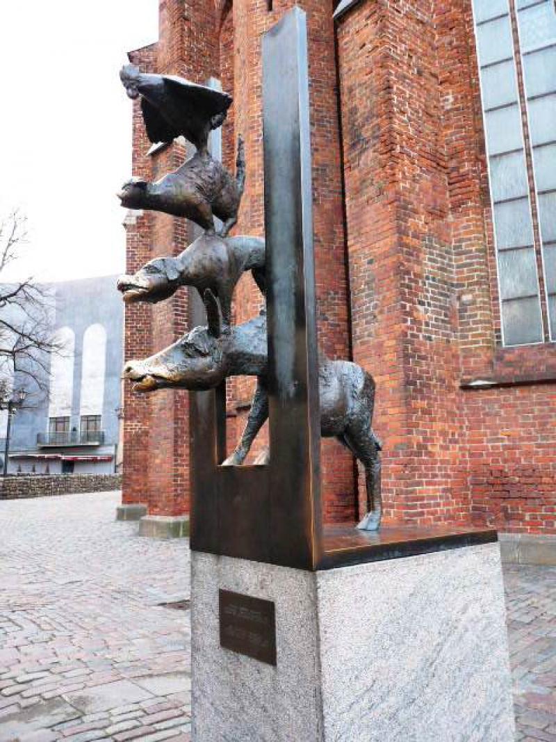Köşeyi dönünce bakın şu karşımıza çıkan sevimli Bremen Mızıkacıları (eşek üstünde köpek, onun üstünde kedi, onun üstünde de horoz) bize gülümseyerek şehrimize hoşgeldiniz diyorlar.
