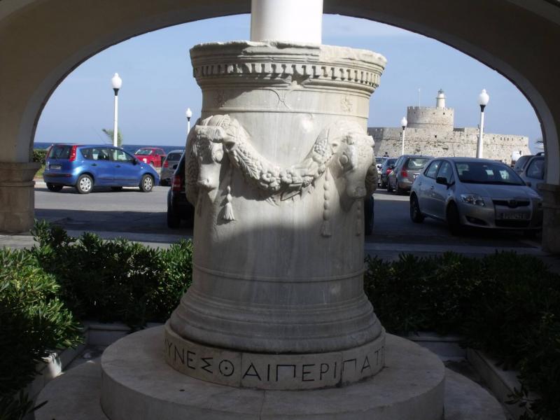 Rivayete göre, limanın girişindeki, Dor’lar tarafından yapılmış, antik dünyanın yedi harikasından biri olan, otuz iki metre boyunda, bronzdan yapılmış, Colossus heykeli, Güneş Tanrısı Helios’a ait. Gemiler limana girerlerken, heykelin bacaklarının arasından geçerlermiş. Deprem sonucu yıkılınca birkaç asır yana yatmış bir durumda kalmış.
