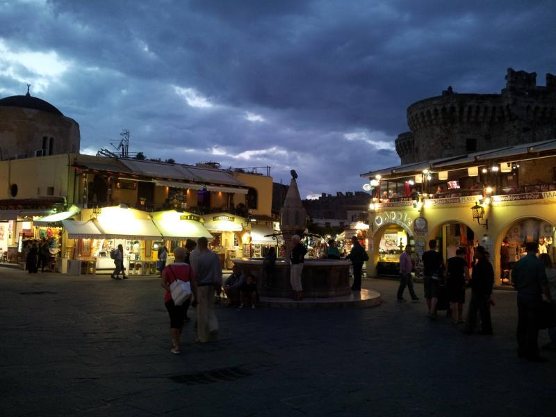 Gözümü açınca caddenin üst kısmında Sultan Süleyman Camisi’ni görüyorum. Caddede birkaç kez gidip geldikten sonra, kafa kafaya vermiş, üç denizatı heykeliyle süslü çeşmesi olan, Rodos’un en hareketli yerlerinden Hipokrat Meydanı’na varıyoruz. Burada tarih boyunca çeşitli yerlerden ticaret için gelen insanların buluşma noktası, merdivenler var. Her yaştan, her milletten insanın gelip, oturdukları, yemeklerini yedikleri, çok hoş bir yer. Meydandaki kafeler, restoranlar, tavernalar tıklım tıklım dolu. Müzikli olanlarda eğlence gece yarısı başlıyor, uzo eşliğinde sabahlara kadar devam ediyor.