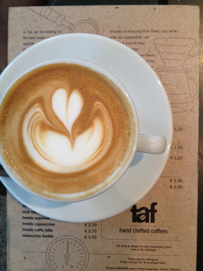 Eleftheriou Venizelou Caddesi´nden Emmanouil Benaki sokağı´na döndüğümüzde karşımıza çıkan Taf,pazar günleri hariç her gün servis veriyor. Espresso bazlı içeceklerden, farklı demleme yöntemleri ile hazırlanan kahvelere kadar pek çok çeşit mevcut. Espresso ile cappuccinomuzu keyifle içtikten sonra artık yolumuza devam ediyoruz. Eğer sizin de merakınız “iyi kahve” ise, bu mekanın haricinde, Eleftherios Venizelou caddesi üzerinde Foyer Espresso Bar, Coffee Lab ve Coffee Brands isimli kahve dükkanları da mevcut, aklınızda bulunsun.
