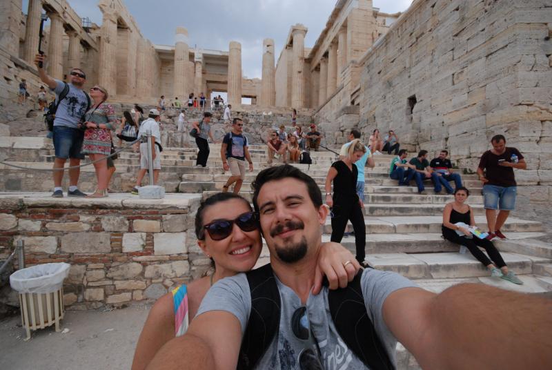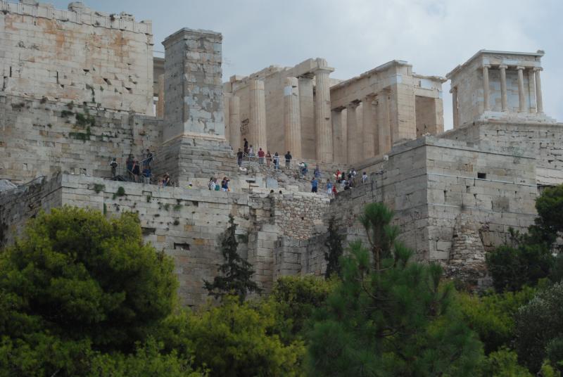 Atina´da yüksek bir kayalık bölgenin üzerinde bulunan veantik yapı kalıntılarını içeren Akropolis´e girmek için önce bilet gişesinden kişi başı 20 euro olan biletlerimizi alıyoruz. Burada iki not eklemek istiyorum: ilki, zemin çok kaygan, her yerde bu konu ile ilgili ikaz tabelası da mevcut ama aklınızda olsun, mutlaka sağlam basın; ikincisi ise, girmeden önce içecek bir şey alıp hem içerim hem gezerim demeyin, su haricinde başka sıvı kesinlikle kabul etmiyorlar, bu da ayrıca aklınızda olsun, bizim gibi koştura koştura içmek zorunda kalmayın buzlu içeceğinizi.