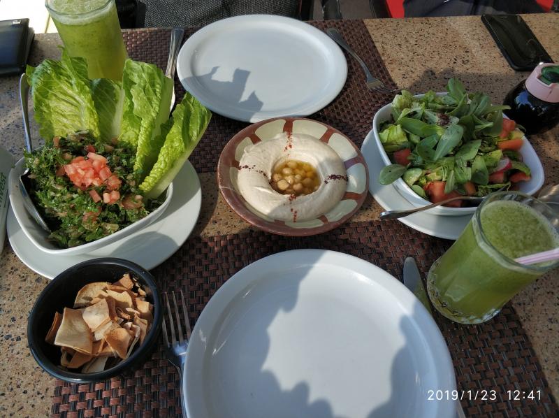 Güvercin kayalıklarına nazır Bay Rock Cafe'de Lübnan'ın meşhur mezelerinden tatmaya başladık. Tabbule (maydanozu bulgurlu salata), fattuş (semizotu salatası) humus (meşhur nohut ezmesi) ve naneli limonata aldık, hepsi de çok lezzetliydi. Sonrasında Zaytunay Bay yat limanına yürüyerek gittik, burası yeni binaların çevrelediği modern bir yer, kıyı boyunca çeşitli cafe & restorantlar var, hafta içi olduğundan çok kalabalık değildi.