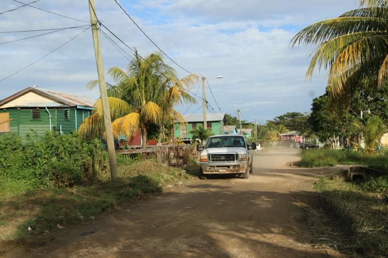 Dangriga Havaalanı, San Pedro’dakinden de ufak. Burada ilk olarak deniz kenarındaki Pelikan Beach Otel’e gideceğiz. Otele giderken şehrin içinden geçiyoruz. Ama şehir dediğime bakmayın. Burası şehirden çok bir köy havasında. Her yerde tek ya da iki katlı ahşap evler var. Yolların çok azı beton, genelde seyahat toprak yolda yapılıyor.