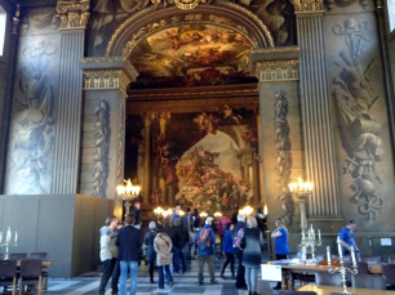 Doğru yerdesiniz, ama öncelikle şu kulelerin sağ tarafta olanına doğru ilerleyip içeri girin. Burası "Painted Hall" yani boyalı salon. Deniz donanması mensupları (gazileri), emekli olduklarında o zamanlar hastane olan kolejde yaşamaya devam etmişler ve bu salonu yemekhane olarak kullanmışlar. Aslında yemekhane biraz küçümseyici bir tabir olur her yanının resimlenmesi 19 yıl alan bu muazzam salon için. 1696 ve 1712 yılları arasında Christopher Wren tarafından ve Paris’teki Les Invalides ve Chelsea Hastanesi kalıplarından inşa edilen bu bina ayrıca Traflagar savaşını Büyük Britanya’ya kazandıran ama savaş sırasında ölüp bir rom fıçısında (naaşını muhafaza etmek için) İngiltere’ye getirilen Amiral Nelson’un mezarını da barındırmaktadır. Painted Hall’u gezdikten sonra aşağı kata inin burada bir tünel göreceksiniz, tünelden karşı tarafa yürüyün. Yolun bitiminde yukarı çıkın. Şimdi diğer kuledesiniz ve burası mermer görünümlü ama aslında karışık plaster olan bir malzeme ve ahşap oymacılığıyla döşenmiş harika bir neoklasik şapel. Burayı da gördükten sonra az önce gözünüze kestirdiğiniz Greenwich Parkına doğru yürümemek için hiçbir nedeniniz yok.