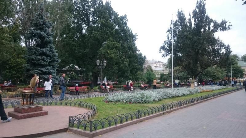 Odessa’yı üç bölgeye ayırıp, vakit varsa üç günde gezmek; yoksa hızlandırılmış bir programla iki günde gezmek mümkün.İlk gün Derybasivska Caddesi’nde geziye başlayabiliriz. Caddenin büyük bölümü trafiğe kapalı. Cadde üzerindeki Şehir Bahçesi ismi verilen park, ilk durak noktamız. Parkın içinde çeşitli heykeller, çardak ve kafeler yer alıyor. Zaman zaman parkta çeşitli etkinlikler de yapılıyor. Benim gezi tarihlerimde Odessa’da caz festivali olduğu için parkta kurulan sahnede canlı olarak caz dinleme imkanı bulduk. Parktaki heykellerden üçü; 12 Sandalye Heykeli, Leonid Utiosov Heykeli ve Kalp Heykeli. Sovyet edebiyatını mizah, taşlama ve ironi unsuruyla tanıştıran İlya İlf ve Yevgeni Petrov'un beraber yazdıkları 12 Sandalye kitabına ithafen parkın içerisine bir heykel konulmuş.