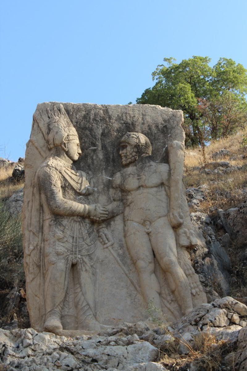 İlk durağımız Arsemia antik kenti. Burası Kommagene Krallığı’nın yazlık başkenti ve yönetsel merkezi olarak geçiyor. Kral I. Antiochos’un batı ve doğu kültürlerini birleştirme, bir Greko-Pers kültür/devlet yaratma ideali, aynı Nemrut’taki tanrı heykellerin karmasında olduğu gibi, bu antik kentte de belirgin. Herakles ve Antiochos’un babası Kallinikos’un tokalaşma rölyefi bunun en güzel örneği.