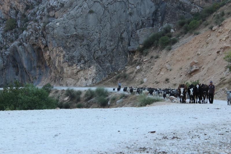 İstikametimiz Cendere Köprüsü diye biliyoruz ancak Ziya Abi, aracı yolda birden durduruyor ve aşağı indiriyor bizi. “İşte!” diyor, “ben buralıyım.”. Uzaktan da olsa bu dağ köyünün dev kayaların ardından yarıp da kendine yer açmış enteresn görüntüsüne bakarken günümüzün en ilginç sürprizlerinden biriyle karşılaşıyoruz. Birden bire yolu kocaman bir keçi sürüsü kaplıyor. Bizim gittiğimizin ters istikametine, yokuş yukarı, hızlı ama acelesiz yürüyorlar. Başlarında 2 çoban var, birkaç inek de önlerinden yürüyor. Keçiler bize hiç aldırış etmeden gündelik işlerine bakıyor ve boyunlarındaki çıngırakları öttürerek kırıta kırıta önümüzden geçiyorlar. Bu sevimliliği kameralara almamak imkansız.