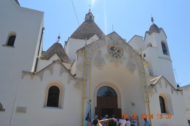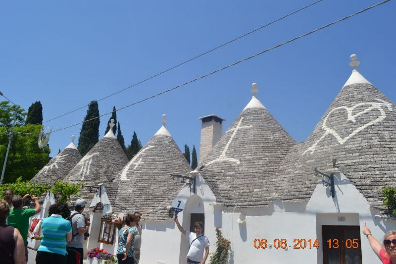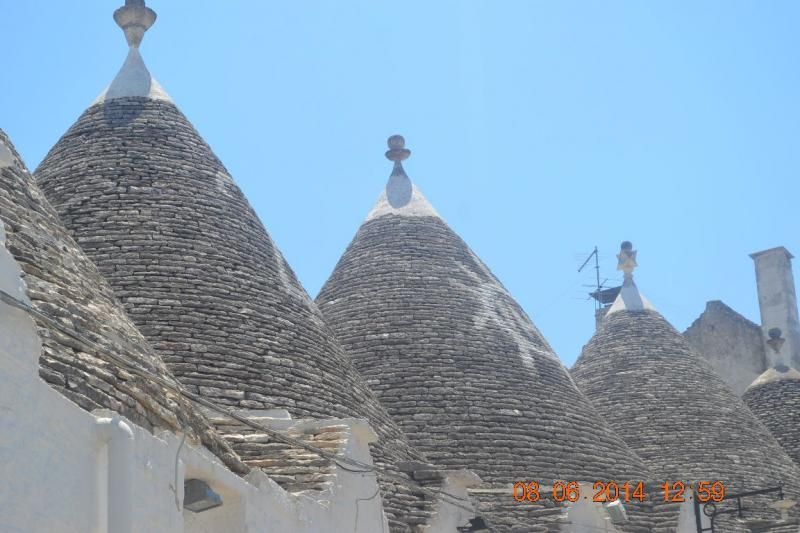 “Güzel ağaç" anlamına gelen ve masal kitaplarındaki resimleri anımsatan taş döşeli sokakları, Puglia bölgesine özgü koni (Trulli) şeklindeki gri çatılı beyaz badanalı evleri ile ünlü Alberobello’ya geliyoruz. Konik çatının üzerinde bir mihenk taşı, taşa da bir ip bağlanmış. Bu oldukça ilginç evler ve çatılar çobanlar tarafından vergiden muaf tutulmak amacıyla bölgeden çıkan küçük kireç taşlarının harç koymadan üst üste yerleştirilmesiyle yapılmış. Zira o devirlerde çatısı olan her binadan vergi alınacağı ilan edilmiş, fakir halk da vergi ödememek için vergi memurların geleceğini haber alınca, eşyalarını bodrum kata taşıyarak ipi çekip çatıyı yıkıyorlar ve memurlar gidince çok kolay yapımı olan çatıyı tekrar yapıyorlarmış. En eski evin 16. yüzyıla ait olduğu ve bu yapı tekniğinin Ortadoğu’dan geldiği söyleniyor. Gerçekten de Türkiye’deki benzer çatı yapısına sahip Harran evlerinin geçmişi çok daha eski.