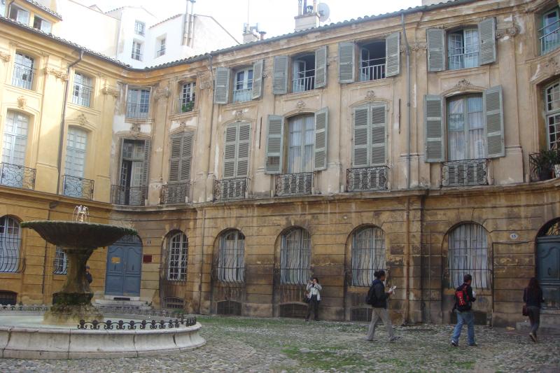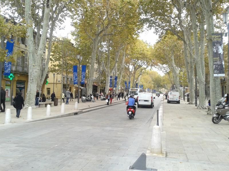 Arabayı park edip her zamanki gibi yaya olarak şehir keşif turumuza başlıyoruz. Öncelikle Place De Gaulle (De Gaulle Meydanı)’e çıkan iki büyük caddeden biri olan Victor Hugo Caddesi’nden ilerliyor ve meydana varıyoruz. Meydandaki büyük havuz ve fıskiye görülmeye değer… Yalnız meydanda inşaat çalışması sürdüğünden, bir bölümü yaya ve araç trafiğine kapatılmış. Biz de alt geçitten geçip biraz sağa doğru ilerlediğimizde şehrin en önemli caddelerinden biri olan ve neredeyse Paris’teki Champ Elysee kadar geniş, 17. yüzyıl yapımı Cours Mirabeau’ya ulaşıyoruz. Burası; geniş kaldırımlı, üzerinde birçok kafe & restoran ve hediyelik eşya satan dükkân olan, çok fazla araç geçmeyen bir cadde. Bu güzel caddede arka arkaya dört büyük çeşme ve heykel var ve hepsi de görülmeye değer. Bu caddedeki kafelerden birine oturup kahvelerimizi yudumluyor ve Fransa’da moda olduğu üzere; gelen geçene bakıyor, şehri ve insanlarını tanımaya çalışıyoruz.