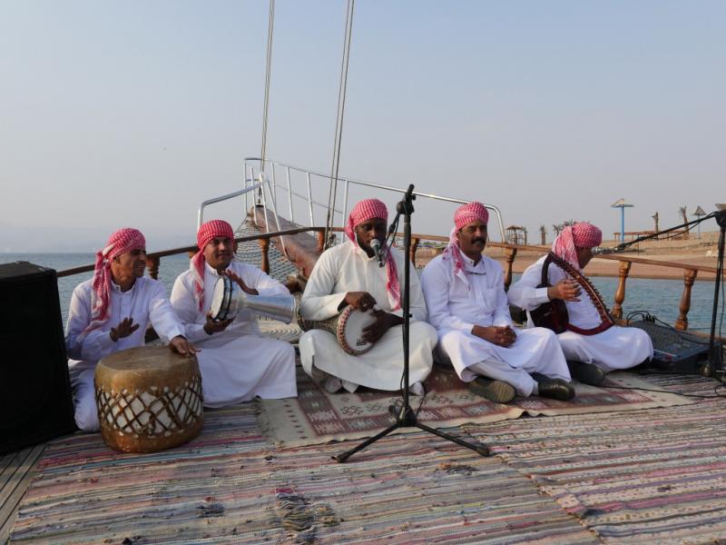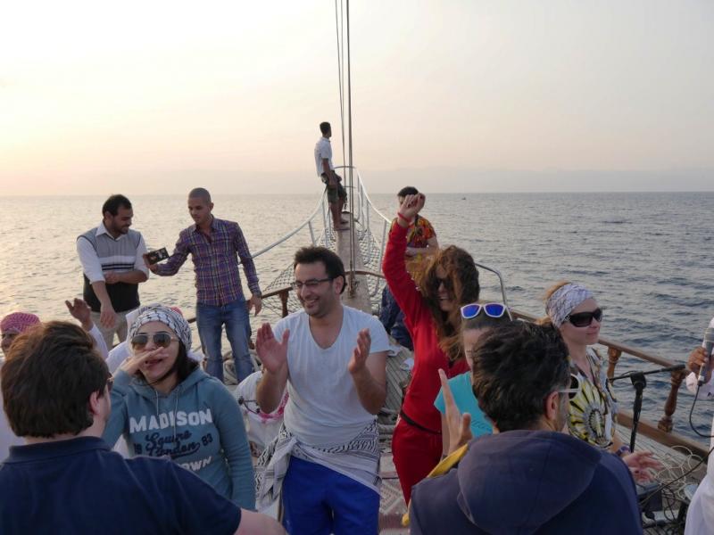 Bu beach club’da yaklaşık 1 saat kadar kalıp bu kez de su altını şnorkel ile keşfettikten sonra açık büfede leziz yemekler yedik. Burada humus müptelası olduğumun farkına varmam da ayrıca enteresan oldu. Yemek sonrası bize özel ayarlanmış bir tekne ile bu kez Akabe’yi Kızıldeniz üzerinde süzülerek izlemek oldukça keyifli. Teknede 5 kişiden oluşan yöresel müzik grubu öncelikle Ortadoğulu gazeteci grubun kanını kaynatınca ardından Avrupalılar da başladı dans etmeye.