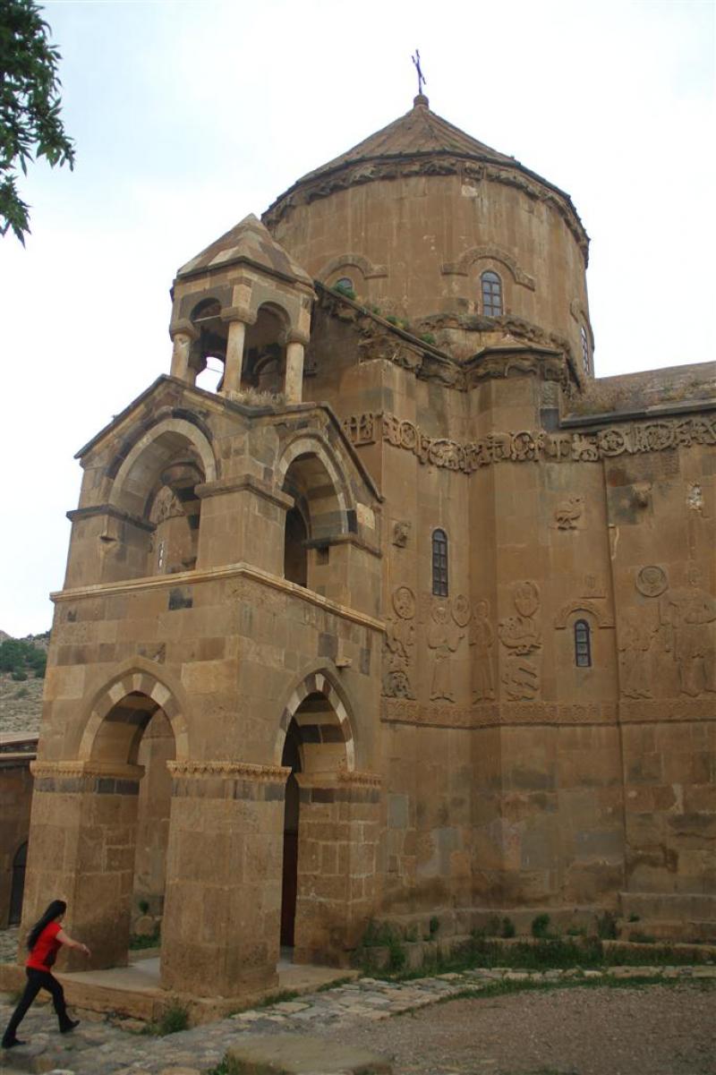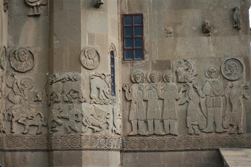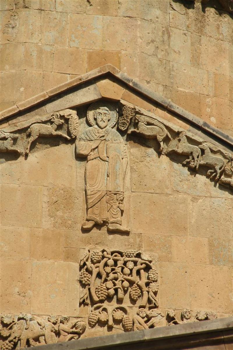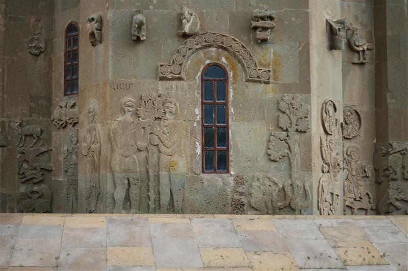Kilisenin duvarlarında ise daha önce Gürcistan'da gördüğüm bantlar halinde taş kabartmalar ve bunları konu alan İncil ve Tevrat'tan alınan kutsal isimler ve av sahneleri yapılmış.