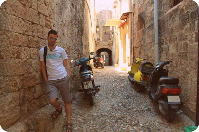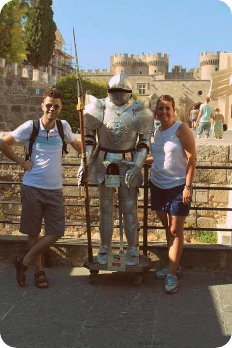 Otele doğru yol alırken şehrin tarihi dokusu sizi içine çekiveriyordu. Belki tekrar aynı yerlerden geçemeyeceğimizi düşünerek sık sık fotoğraf çektik. Bir sahne içindeymişiz gibi kendimizi internette gördüğümüz yerlerin içinde buluverdik. Başta İngilizler olmak üzere çok sayıda turist vardı. Kalacağımız otel çok merkezi konumda ve online konaklama sitelerinde oldukça iyi puanlar almıştı. Biz mutfağı içinde bir daireye 100 tl ödedik. Otele vardığımızda bizi resepsiyonda Mike karşıladı. Mike yaklaşık 60 yaşlarında sıcakkanlı bir Yunanlıydı. Türk olduğumuzu öğrendiğinde bizi Türkçe selamladı. Otel ve odamız hakkında bilgiler verdi ve bir de şehir haritası elimize tutuşturdu. Unutmadan otelin ana kapı anahtarını da verdi. Olurda geç gelirseniz kapı kapalı olur dışarıda kalmayın diye yanınızda bulunsun dedi. Oda da kısa bir molanın ardından tekrar eski şehre yola koyulduk. Rodos kalesi gerçekten çok iyi korunmuş. Köşe başından bir şövalye çıkacakmış hissi yaratıyor. Hipokrat Meydanı ve yol üstündeki ki hediyelik eşya satan dükkânlarda uzunca molalar verdik.