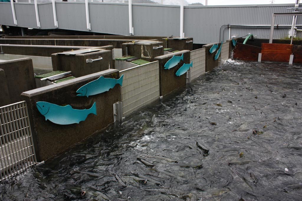 Somon çiftliğinde doğal bir şelale havasını verecek şekilde kademeli havuzlar oluşturulmuş. Somonlar bu havuzlarda çırpınıp çırpınıp yukarıya zıplıyorlar. Bu doğal şelale ortamında zıplayan somonlar için tabii ki burada ayıya yem olma riski yok.