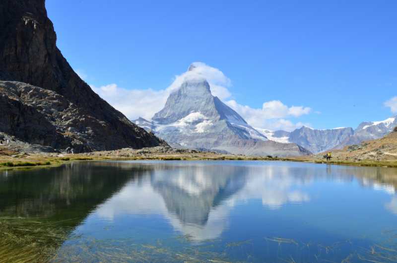 Gornergrat’ta çevreyi dolaştıktan ve fotoğraflarımızı çektikten sonra Riffelsee’ye doğru yola çıkıyoruz. Son fotoğrafımızda küçüklere kayağı sevdirmek için Zermatt bölgesinin kayak okullarının maskotu olan kuzu Wolli’yi atlamıyoruz :) Yaklaşık 45 dakikalık yokuş aşağıya bir yürüyüşün ardından, ünlü Matterhorn manzaralarının çekildiği Riffelsee’ye varıyoruz. Her ne kadar hava hafiften esiyor olsa da, Matterhorn’un suya düşen yansıması gerçekten çok güzel. Bu güzel manzara eşliğinde sandviçlerimizi ve Toblerone’umuzu afiyetle yiyoruz :)