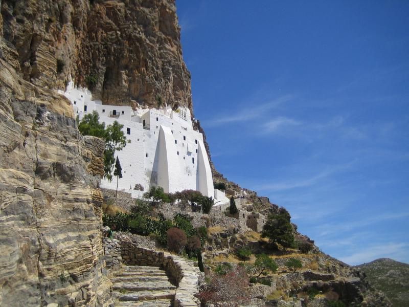 Manastır 1088’de, Meryem Ana’nın bir ikonası mucizevi bir biçimde Filistin’den Amorgos’a getirildikten sonra kurulmuş. Yıllar içinde, aralarında Venedikliler ve Türklerin de olduğu değişik hükümranların etkisiyle değişmiş, ama her yıl 21 Kasım’da düzenlenen bir festivalde ikona inananlara hâlâ sunuluyor. Bina 40 metre uzunluğunda olmasına karşın genişliği 5 metreyi geçmiyor, sekiz katı bir dizi dar kaya basamakla birbirine bağlı. Bir sürü keşiş hücresinin yanı sıra bir hazine odası, mutfak ve kiler odaları var. Manastırdan görülen manzara nefes kesici.