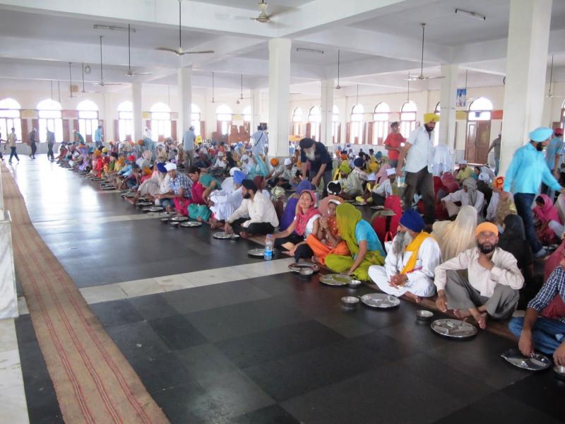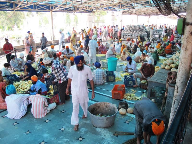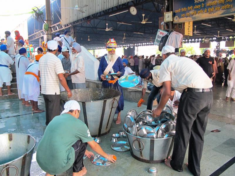 Altın Tapınak’ta göl kıyısında oturup günün farklı saatlerinde tapınağı izlemek haricinde yapılması gereken diğer bir şey de dev kantinde gurularla, Sih dinine inanan ziyaretçilerle ve aralara karışmış bizim gibi meraklı turistlerle birlikte yere oturup yemek yemek. Bu kantinde pişen yemekler ücretsiz olarak her isteyen ziyaretçiye dağıtılıyor. Yemek sonrası isterseniz küçük bir bağış yapmanız mümkün. Yemeklerin piştiği mutfağı ve devasa kazanlarda gönüllülerin bulaşık yıkadığı bulaşıkhaneyi görmek lazım. Yemek yemek için kantinde yerde sıralanmış olan konukların yanına çöküyoruz ve ellerindeki büyük tencerelerle dolaşıp yemek dağıtan gönüllülerin bize ulaşmasını bekliyoruz.