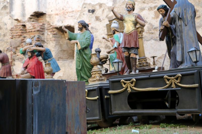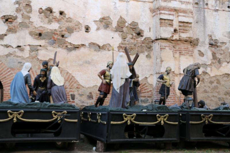 Buradan biraz ilerlediğimizde yolun sol tarafında kalan bölgede çeşitli dini figürler görüyoruz. Buradaki dini figürler Paskalya döneminde ve belli başlı dini bayramlarında kullanılıyor. Özellikle Antigua halkı Paskalya’yı çok coşkulu bir biçimde kutluyormuş. Hatta paskalya döneminde her aile kendi evinin önüne talaş tozu, boya ve çiçekler kullanarak “alfombra” adını verdikleri bir halı hazırlıyormuş. Ardından da halı kortejin yürüyüşüne kadar bozulup dağılmasın diye sürekli bu halıları muhafaza etmeye çalışıyorlarmış.