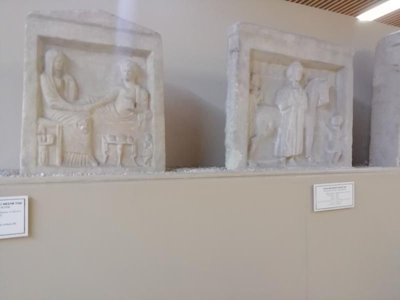 Giriş katındaki gezimizi tamamladıktan sonra bir üst kata çıkıyoruz. Üst katta bizi öncelikle İstanbul’un çeşitli ilçelerinden (Kadıköy, Pendik vb.) çıkartılan milattan önceki taştan yapılma malzemeler (kesici olarak kullanılan taşlar, kaplar vb.) karşılıyor. Daha sonra karşımıza mezar taşları çıkıyor. Mezar taşlarını incelediğimizde hepsinin üzerinde çeşitli konuların işlendiğini görüyoruz. Kimisinde tokalaşarak birbirlerine veda eden aile fertleri, kimisinde mezarda yatan kişinin mesleğini anlatan çalışmalar mevcut. Örneğin göktaşı bilimcisine ait olan bir mezar taşında, bir elinde küre bulunan bir erkek, yanında eşi; arka planda bir raf ve rafın üzerinde kişisel eşyalar dahi betimlenmişti.