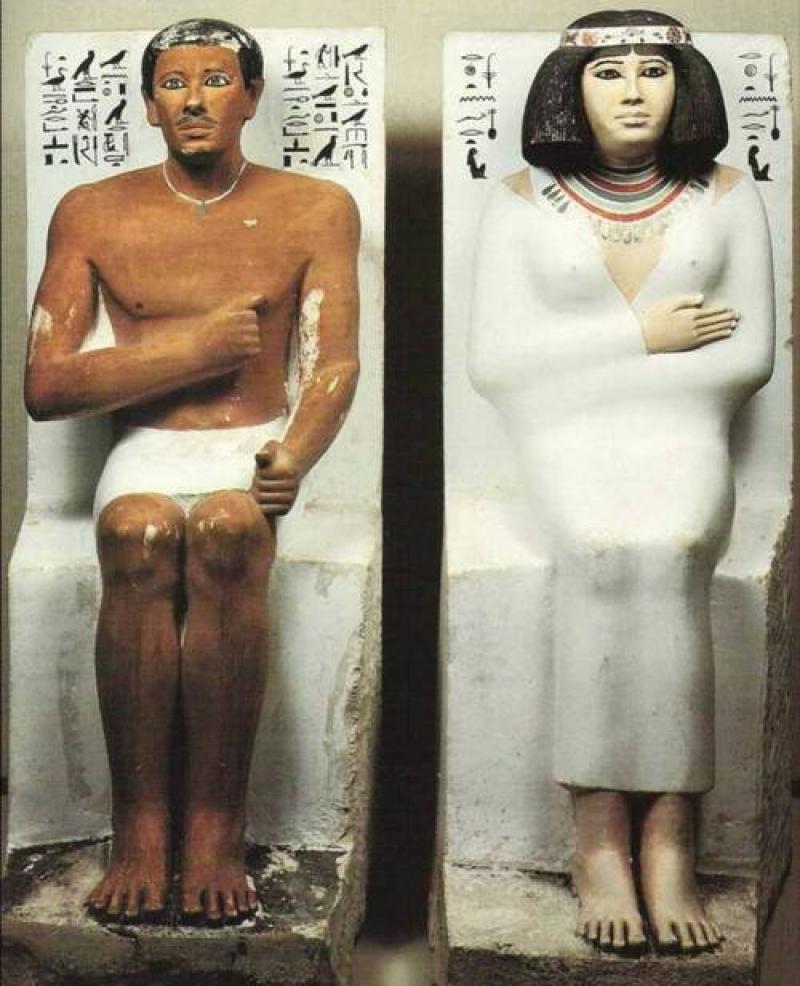 RAHOTEP VE NOFRET. Mısır Müzesi, Kahire. Boyalı Kireçtaşı. IV. Sülale, M.Ö. 2600. Rahotep’in zenginliği ve Nofret’in kadınsı özellikleri; Nofret’in giysileri, mücevherleri ama özellikle de soluk teniyle verilmiştir.