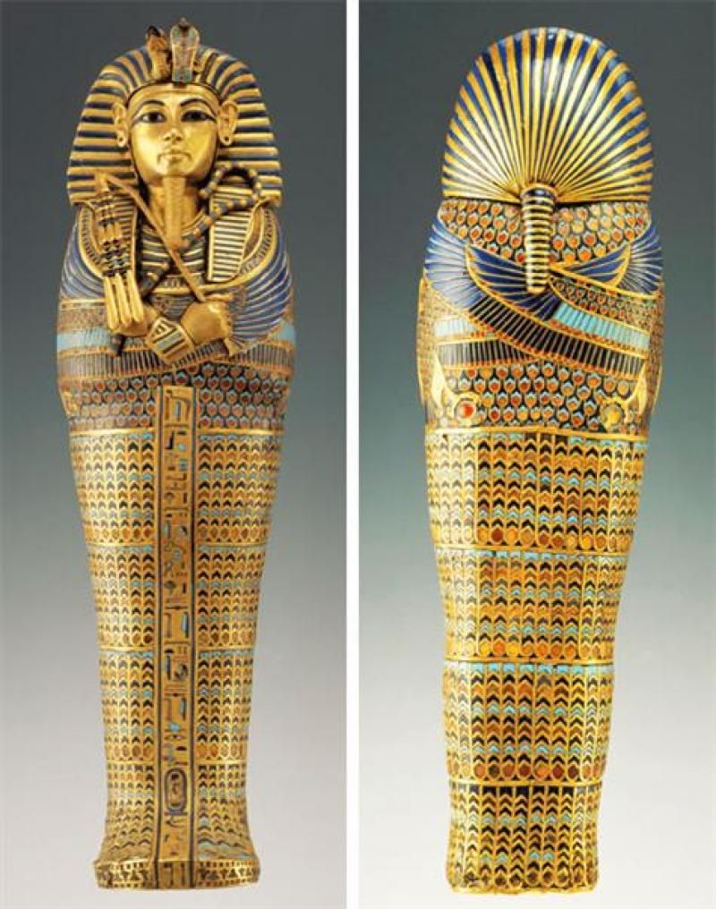 TUTANKAMON’UN LAHDİ. Mısır Müzesi, Kahire. XVIII. Sülale, MÖ 1340. Parlatılmış ve değerli taşlarla süslenmiş som altın, 19 yaşında ölen firavunun servetini ve gücünü aktarmaktadır. Mumyalanmış bedeni, bir taş lahde konulmadan önce kendinden daha geniş iki diğer tabuta yerleştirilecek olan bir tabutun içine yerleştirilmektedir.
