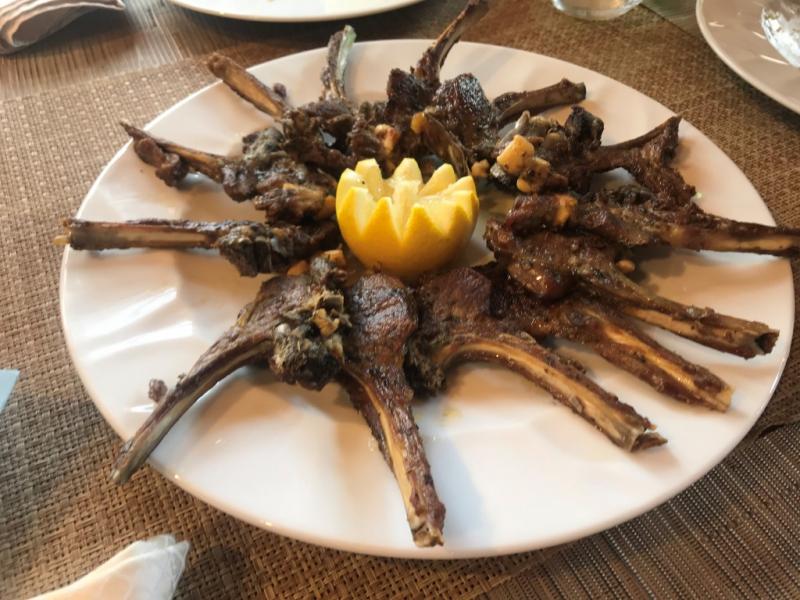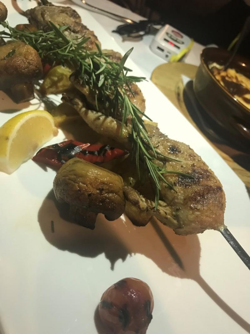 Öncelikle masaya salata, yanında sosuyla kızarmış sebzeler, mozarella ve domates, humus yanında pide ve dolmalar geliyor. Ardından Arnavutluk’a geldiğinizde mutlaka tatmanız gereken bir lezzet olan Elbasan tava geliyor. Daha sonra adının “fergese” olduğunu öğrendiğimiz, benim biraz menemene benzettiğim bir yemek geliyor ve sonra bıldırcın…
