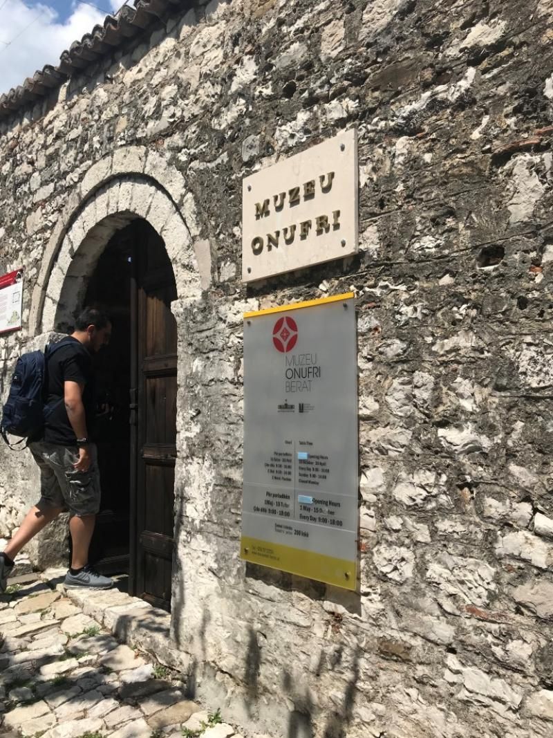 Katedral, Onufri Ulusal İkonografik Müzesi’ne ev sahipliği yapıyor. Berat’taki farklı kiliselerden en önlü Arnavutluk sanatçılarının ikonları toplanıp bu Ortodoks kilisesine getirilmiş. Burasının içi gerçekten harika. Ahşap işçiliği mükemmel, eskiden bu ahşaplardan bazılarının üzeri altın boyalıymış ancak şu anda çok belli olmuyor. Ahşap işçiliği ile 15 sene uğraşılmış. Burada fotoğraf çekmek yasak olduğu için maalesef içindeki güzel ikonları ve ahşap işçiliğini gösteremiyorum. Rehberimiz bize biraz Ortodoks geleneklerinden ve Katolikler ile farklarından bahsediyor. Mesela Ortodokslarda ikonalarda Meryem uyur halde gösterilirmiş ancak Katoliklerde Meryem ölmüş ve göğe yükselmiş şekilde resmedilirmiş.