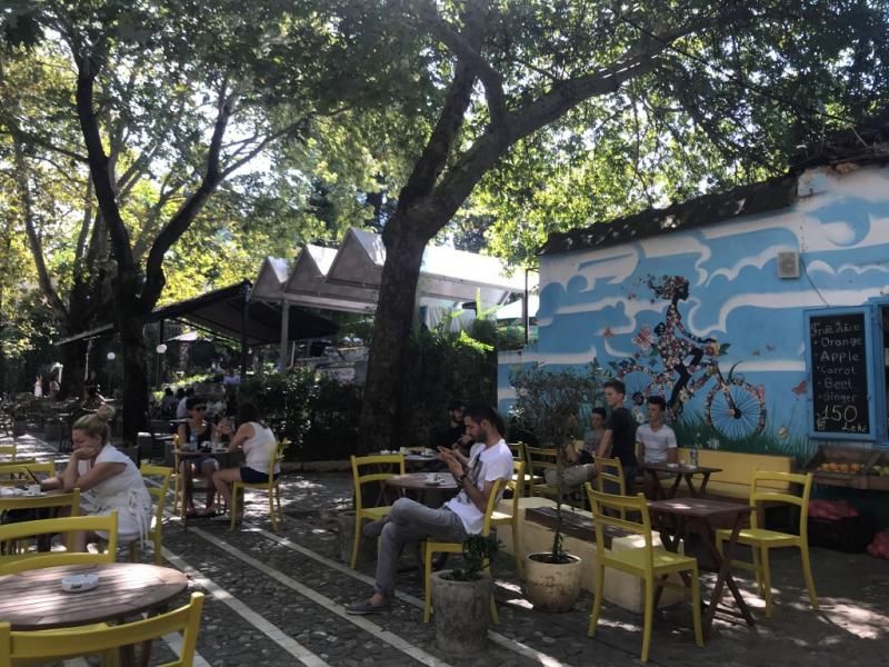 Dilerseniz siz de burada bir kahve molası verebilirsiniz. Aynı zamanda yine bu yol üzerinde birçok Tiranlı küçük masalara oturmuş domino ve iskambil kâğıdı oynuyor, ağaçların arasında serinliyor.
