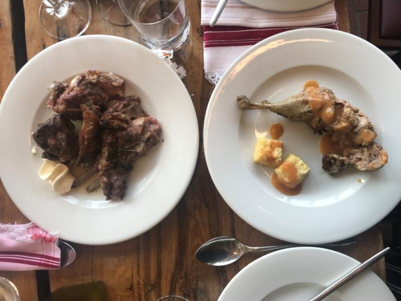 Daha sonra çeşitli peynirler ile kuru etler, mısır koçanının içinde ızgara sebzeler, yaban mersinli makarna ve çeşitli patatesler geliyor. Bir önceki günden alışık olduğumdan hepsinin tadına çok az bakmam gerektiğini biliyorum yoksa ana yemeğe yer kalmayacak :). Daha sonra etler gelmeye başlıyor. Kuzu çevirme, kuzu şiş ve fırında ördek derken artık gözümüz dönüyor.