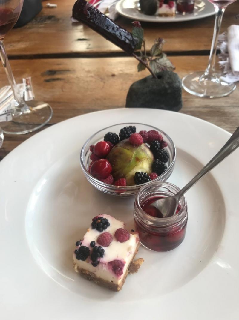 Nihayet tatlılara geçiyoruz. Kırmızı meyveli cheesecake ve böğürtlen sorbe üstüne creme brulée ile kapanışı yapıyoruz. Yediklerimizi eritmemiz lazım!
