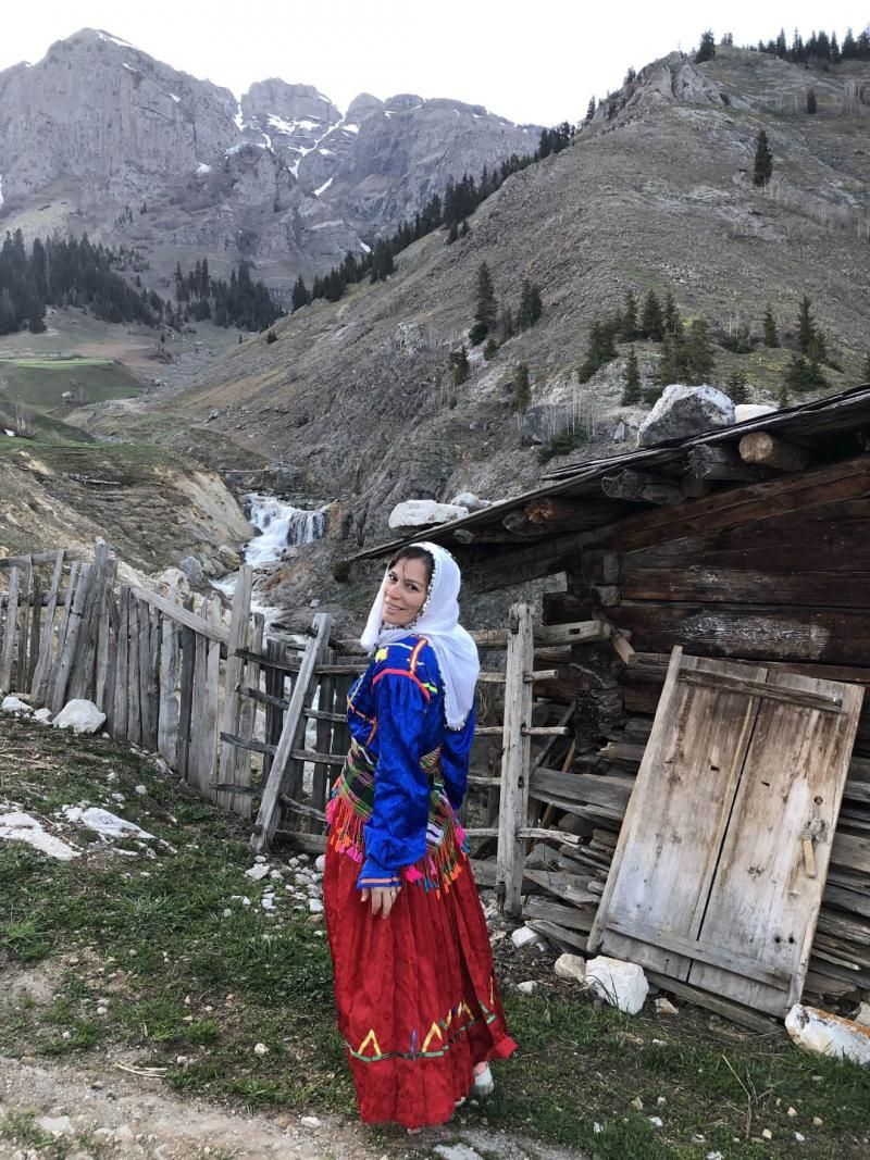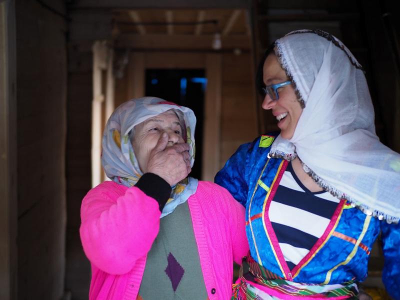 İkincisi Tenzile Teyze’yle tanışmak. Köyde dolaşırken bizi evine davet etti Özcan Hanım ve benim için kendi torunlarına kendi elleriyle diktiği yöresel kıyafetleri özenle sakladığı yerinde çıkarttı. Her biri tertemiz jilet gibi ütülenmiş başörtülerini çıkartıp başımıza bağladı, kıyafetleri giydirdi. Ara ara Türkçe ara ara Gürcüce anlattı.