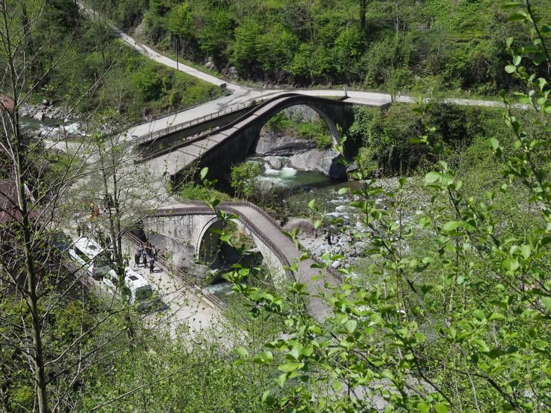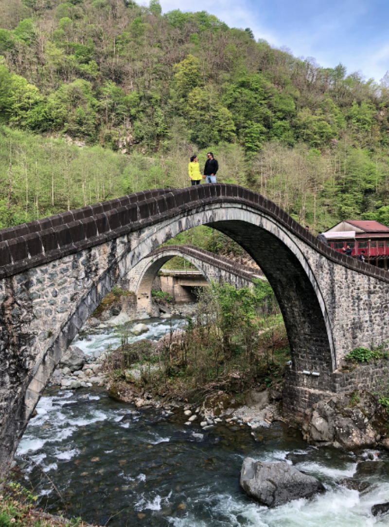 Sıradaki durağımız Arhavi’nin merkezine 14 kilometre mesafede yer alan Çifte Köprü. 18. Yüzyılda Osmanlı döneminde inşa edilmiş olan Çifte Köprü, Durguna Vadisi ve Kamilet Vadisi’nin içinde akan kendileriyle aynı isimleri taşıyan nehirlerin birleştiği noktada yer alıyor. İki nehir burada birleştikten sonra Ortacalar adını alıyor ve Karadeniz’e kadar devam ediyor.