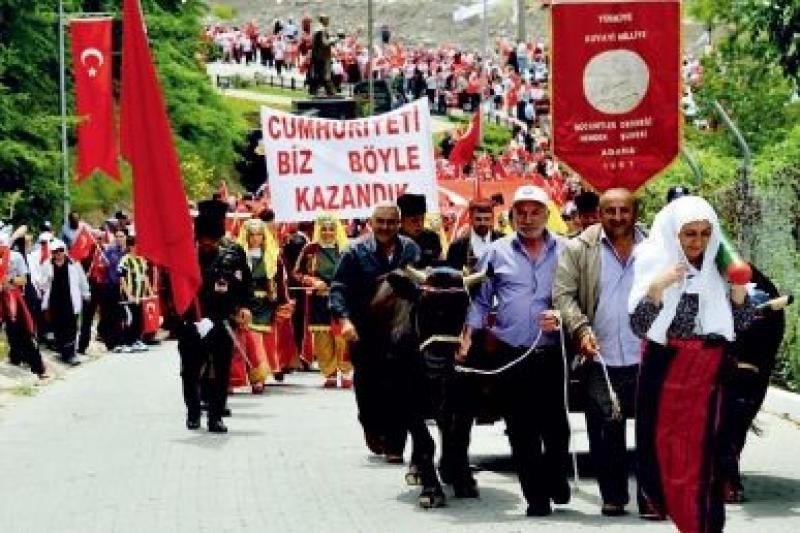 Bundan sonra kortejin en önünde, İnebolu`dan aldığı cephaneyi Ankara`ya götüren kadınlarımızı temsilen, sırtında bebesiyle yürüyen Türk Kadını, ardında çift mandanın çektiği bir kağnı, bando, bandonun çaldığı marşlar, halkın yol kenarlarında ve balkonlarda bayraklarla, coşkulu hoş geldiniz sesleriyle, balkonlardan atılan çiçekler, konfetiler eşliğinde,limandaki tören alanına kadar devam etti. Tören alanında, bu vatan için toprağa düşmüş tüm şehitlerimiz adına yapılan bir dakikalık saygı duruşunun ardından İstiklal Marşı okundu. Kastamonu Vali yardımcısı, İnebolu Kaymakamı, İnebolu Belediye başkanı, günün anlam ve önemiyle birlikte, yürüyüşçülere teşekkür konuşması yaptılar.