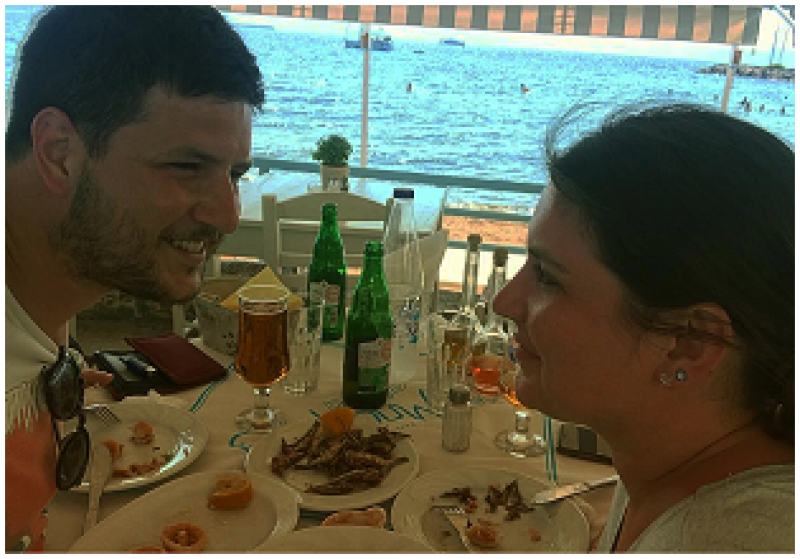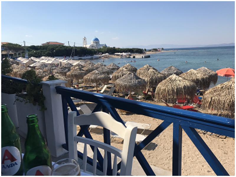 Bu fotoğrafımız Babis Taverna'da çekildi. Aegina'da iki gece kalmamıza rağmen bu mekanda bir gündüz, bir de akşam yemeğimizi yedik. Çünkü tam sahilde, ayaklarınız adeta denize değecek gibi; hem de mükemmel, güler yüzlü personele sahip. Fiyatları da oldukça makul. Az kızartılmış kalamarı muhteşem.