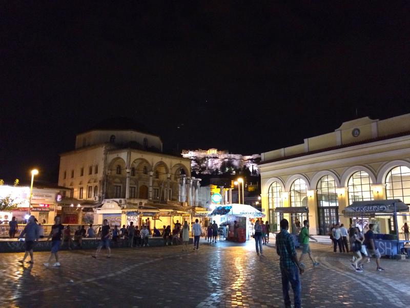 Monastriaki Meydanı ise hareketliliğin kalbini oluşturuyor. Meydanda oturan, eğlenen, biralarını içen bir kalabalık var. Burası da gece gündüz hep kalabalık. Metronun da bulunduğu bu meydanda olan Dzami Dzisdaraki hemen kubbesi ile dikkatinizi çekecektir. Ama boşuna minare aramayın yok. 1821'de yıkılmış. Osmanlı döneminden günümüze ulaşan bu cami şimdi Yunan Dekoratif Sanatları Müzesi'ni barındırıyor. Bu meydanda bulunan A for Athens Oteli'nin barı hem meydanın tadını çıkarmak hem de Akropolis manzarasıyla büyülenmek için ideal konum. Hatta konaklama açısından da seçenekleriniz arasında olmalı. Monastiraki Meydanı'na açılan sokaklardaki tavernalar da hemen dikkatinizi çekecektir. Akşam saatlerinde canlı müzik de eklenince bize hiç de uzak olmayan tatlarla keyif yapabilirsiniz.