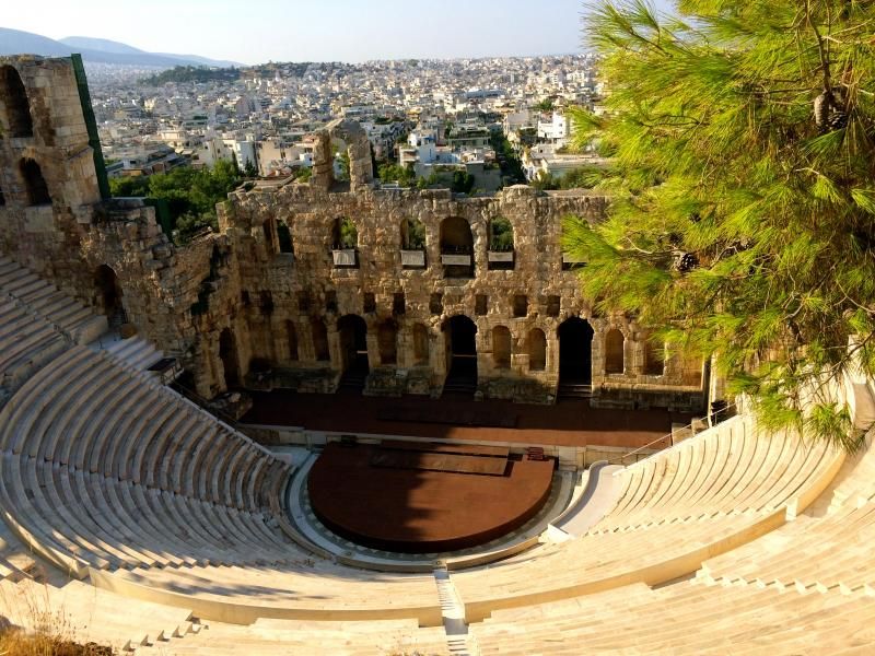 Propylaion'dan (giriş kapısı) girmeden önce yukardan Irodio (Herodes Atticus Odeonu) ve Dionysos Tiyatrosu'nu görmelisiniz. 161 yılında inşa edilen bu mermer odeon, Atina festivallerinde kullanılmakta. Mükemmel akustiğini duymak için gelmeden festival tarihlerine göz atmakta fayda var. M.Ö. 5. yüzyılda inşa edilmiş en eski tiyatro olan Dionysos Tiyatrosu'nda Aristofanes'in komedileri ile Euripides ve Sofokles'in trajedileri sahneleniyormuş zamanında. Tiyatroyu ve akropolisi gezdikten sonra aynı biletle müzeyi de gezebilirsiniz.