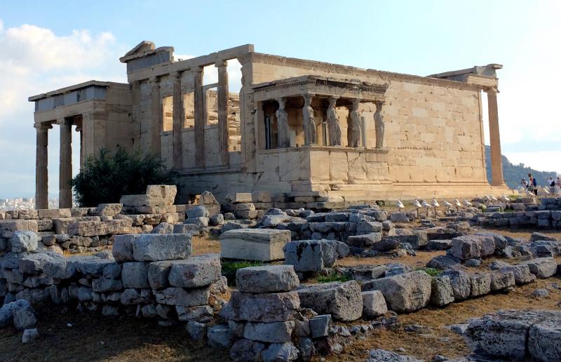 Tapınağın Parthenon'a bakan güney yüzünde karyatidler (kadın şeklinde figürler) yer alıyor. Toplamda altı tane olan bu karyatidlerin asılları Akropolis Müzesi'nde. Lord Elgin tarafından alınan figürlerin bir tanesinin British Museum’da olduğunu söylemeyen rehber yok nerdeyse.