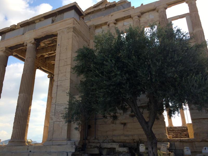 Erectheus'un hemen yanında bir zeytin ağacı bulunmakta. Mitolojiye göre Poseidon elindeki üç çatallı mızrağı yere vurmuş ve bir çeşme ortaya çıkmış. Önce herkes sevinmiş ancak Denizlerin Tanrısı Poseidon’un çeşmesi tuzlanmış ve pek bir işe yaramamış. Athena da elindeki mızrağı yere vurmuş ve ortaya bir zeytin ağacı çıkmış. Barışı ve refahı temsil eden bu zeytin ağacı insanlar tarafından benimsenmiş ve Athena şehrin tanrısı ilan edilmiş. İşte tapınağın batı kısmındaki zeytin ağacı bunu simgelemekte. Hatta denilen o ki Persler akropolise saldırarak bu ağacı yok ettikten sonra bile ağaç yine aynı yerde kendiliğinden yeşermiş.