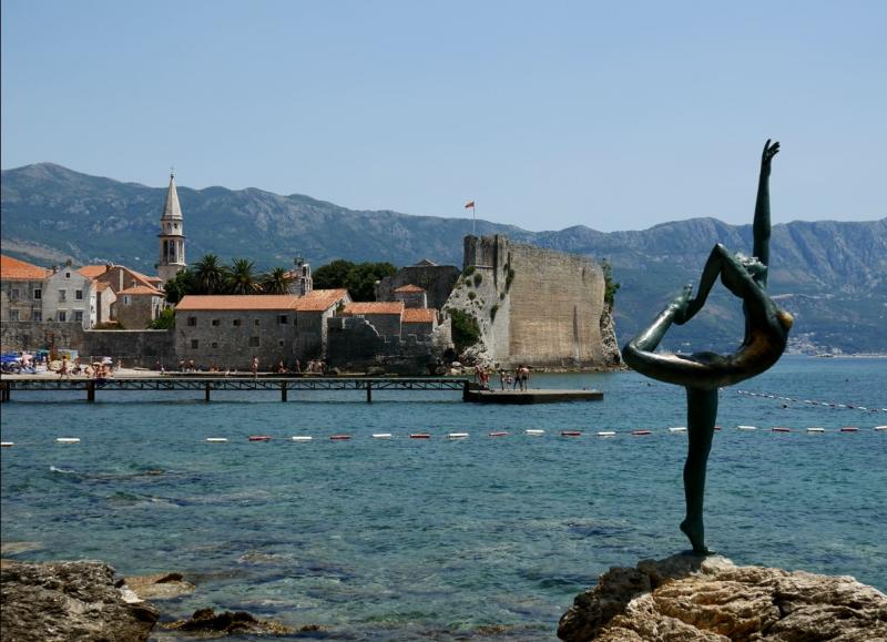 Budva’nın sembolü haline gelmiş olan Dans Eden Kız Heykeli, arka fonda eski kentle birlikte Budva’nın en fazla fotoğraflanan yeri. Efsaneye göre Budva’da boğulan bir kıza ithafen yapılmış olan heykele dokununca şans getirdiğine inanılır.