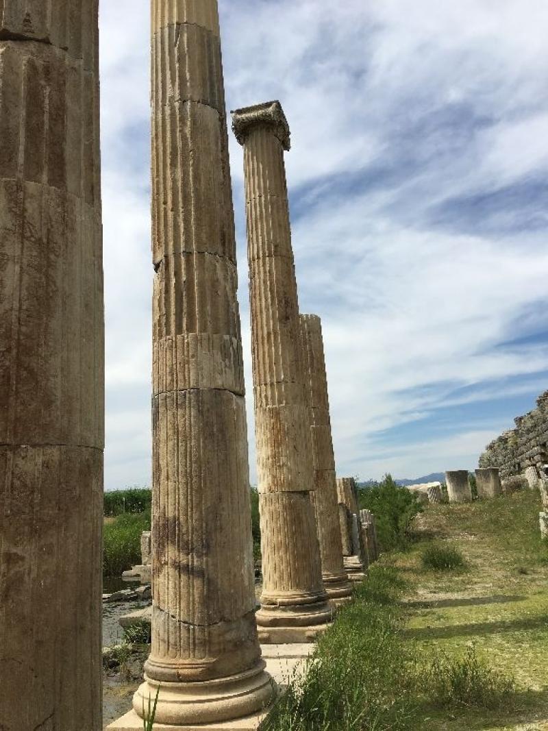 Ancak gişelerden sonra Söke yerine Germencik yoluna girip Ortaklar Belediyesi, Tekin köy sınırları içinde bulunan Magnesia Antik Kenti’ne uğruyoruz. (Ortaklar-Bodrum yönünde 4 km mesafede; İzmir'e 100 km, Söke'ye 16 km.) Adı çok duyulmamış olsa da oldukça önemli bir antik kentimiz. Ülkemizin tarihi eserlerini bilmemiz gerekir diye düşünüyoruz. Sayısız eserlerden birini daha görmek, yolculuğumuzu daha da keyifli ve anlamlı kılıyor.