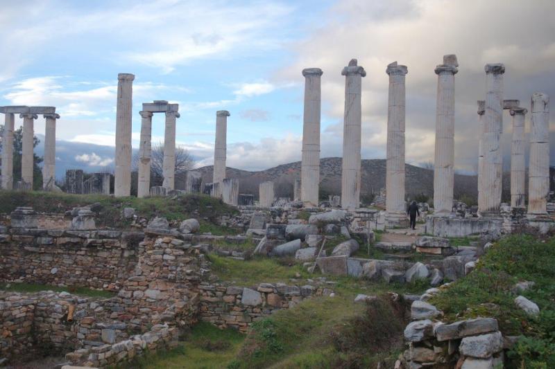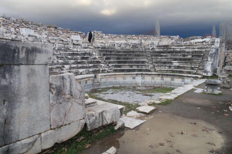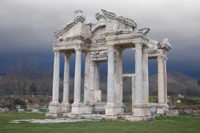 Yazımın başında da belirttiğim gibi adını Aphrodite’den alan Afrodisias’ın, en önemli yapısı Aphrodithe Tapınağı’dır. Mezapotamyalıların istilaları sonrasında yıkılan tapınak, bölgeyi ele geçiren Asurluluarın eklemeleriyle, Mezapotamya kültürünü de tatmış oluyor. Heybetli 14 mavi sütununun hala ayakta olduğu tapınak, kentin kalbinin attığı yerdir.