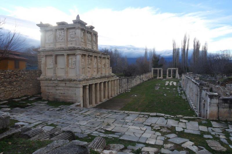 Hellence Dört Kapı anlamına gelen Tetrapylon, antik efsanelerin kabartmalarıyla dolu bir anıtsal yapı. Herhangi biryere giriş olarak tasarlanmayan bu yapı, kuvvetle muhtemel bir buluşma ve toplanma alanı olarak tasarlanmış. Tetrapylon’un uzman arkeologlar, mimarlar ve ustaların işbirliği ile, %80’i kazılarda bulunan parçalarıyla restore edimesinden kısa bir süre sonra Kenan Tevfik Erim vefat eder ve mezarı bu bölgeye yapılır.