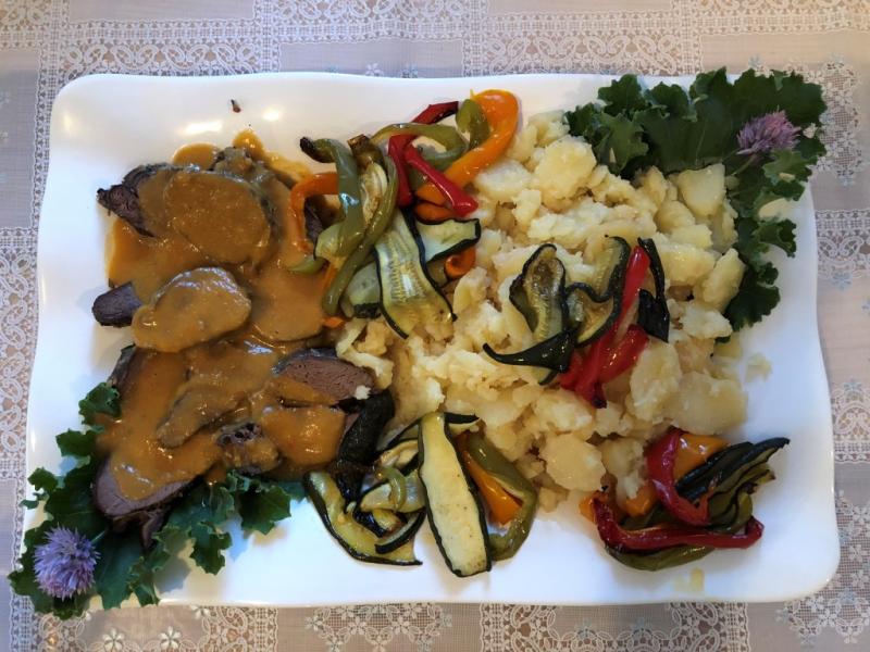 Bayağı gittik eve girdik. Sanki büyükannemin mutfağına girmişiz gibi. Oturduk, sofraya tencereyle yemekler geldi. Burada çorba servisi tek tek yapılmıyor, tencereyle ortaya geliyor, isteyen istediği kadar alıyor. Biz de burada soslu et ve yanında patates haşlaması tarzı bir yemek yedik.
