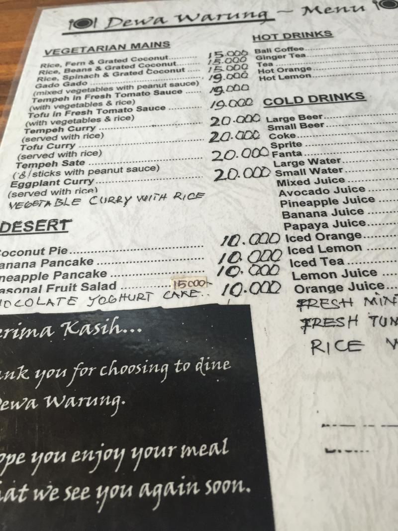 Benim tavsiyem daha lokal tatları daha uygun fiyata bulabileceğiniz mekanlar. Özellikle jl.gootama üzerinde bulunan Dewa Warung oldukça lezzetli bir menüye sahip. Bu sokakta bulunan diğer yerler de denenmeli; mesela Biah Biah. Buraya ana cadde üzerinden giderken Ubud Sarayı'nı geçince ikinci sokaktan sağa dönerek ulaşabilirsiniz. Kahve için ise sağa değil ikinci sola dönerseniz Seminyak coffee studio mevcut. Bu sokak üzerinde de vegan yiyecekler de bulabileceğiniz mekanlar var.