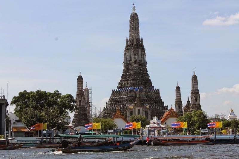 Otelimizin yakın olduğu Asok durağından skytrain ile Saphan Taksin durağına geliyoruz. Burası şehrin bir diğer önemli ulaşım aracı teknelerin uğradığı ana durak. Chao Phraya Nehri şehrin ulaşımında önemli bir rol oynuyor. Bu duraktan turist tekneleri kalktığı gibi 0,20 baht gibi neredeyse bedava bir ücretle kalkan halk tekneleri de var. Turist teknelerini pek kullanan olmazken bu teknelerde halktan fazla turist var. Tekneyle ulaşmak istediğimiz hedef ise Wat Pho Tapınağı ve Saraylar Bölgesi. Bangkok, 400 adet tapınağın bulunduğu bir tapınaklar bahçesi adeta. Gerek tekne ile gerek başka bir ulaşım aracındayken çevrenizde her zaman tapınaklar oluyor. Saraylar bölgesinde durağa yaklaştığımızda ise bu tapınakların en fotojeniği ve estetiği olan Wat Arun karşımıza çıkıyor.